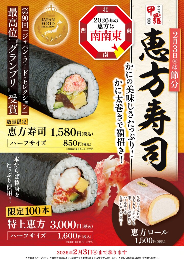 2月3日(火)は節分です。甲羅本店ではかにの美味しさたっぷりの恵方寿司をご用意しております。